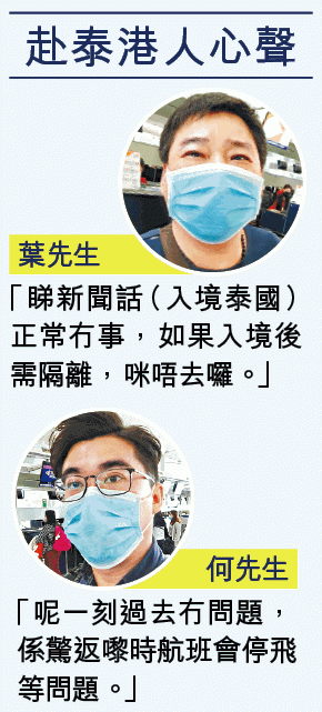 【本報訊】泰國近日入境檢疫措施出現訊息混亂,一度傳出強制隔離入境港人,但其後當局澄清只是建議來自受疫情影響地區的旅客,抵埗後自行留在室內。不少港人昨如期出發赴泰旅遊,有市民直言不怕未能入境,反而更擔心是泰國會否突然「封關」令航班停飛,變相回港無期。「泰國通」胡慧沖昨稱未收到遊泰的港人被拒入境或被安排隔離,估計最新消息或要待當地政府於明日再公佈。