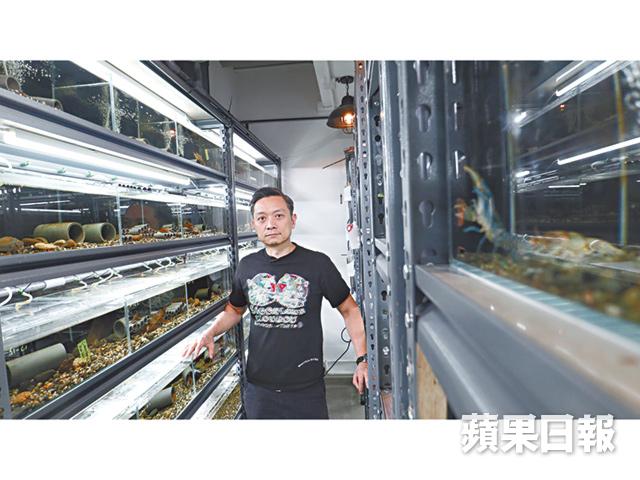 踏入他位於工廈的設計工作室,表面看來平平無奇,但打開暗門內有乾坤。一間房三面牆圍繞着數十個玻璃魚缸,是他用來招呼朋友一同欣賞螯蝦的地方;另一間房響着隆隆水泵聲,整整齊齊架置着一排排高過人的「魚缸牆」,「這裏是我的秘密基地,是我的養殖室,一般不會招待朋友。這裏的設計如圖書館般一層層排列,方便我分開不同的螯蝦品種飼養,這裏有大概200個缸左右。」說是工作室,其實這裏看起來更像水族店。