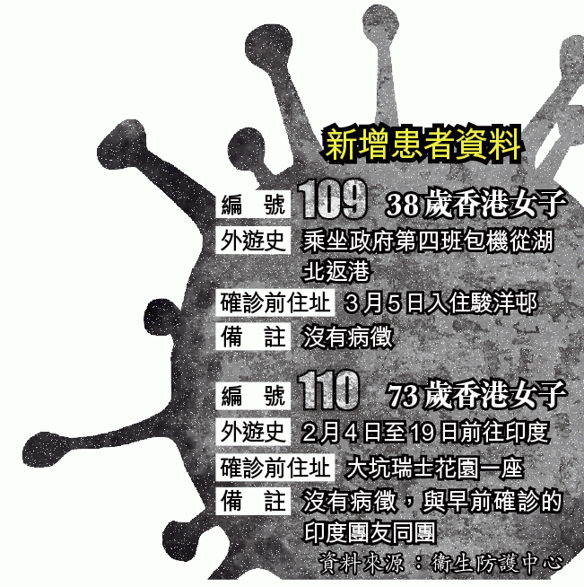 衞生防護中心傳染病處主任張竹君昨在疫情簡報會上表示,昨日新增的第109宗確診個案是38歲女子,1月中到武漢探親,一直住在親戚家中,「冇乜周圍去」,並無病徵,3月5日乘第四班包機從湖北返港,在檢疫中心內亦是單獨居住,6日檢取呼吸道樣本,昨日證實呈陽性。醫管局總行政經理庾慧玲表示,已抽取431名由湖北返港人士的樣本,只有上述一人呈陽性,其餘所有樣本呈陰性。