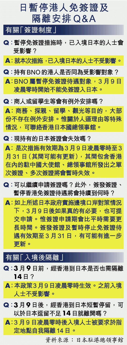 根據日本駐港總領事館公佈的詳情,暫停港澳人士免簽證入境待遇的措施中,商務、探親、留學等目的亦不會獲例外安排;惟關於人道理由等特殊情況,則可與領事館直接聯絡。至於明日凌晨零時之後入境日本的港人,需於指定地點自我隔離14日,其間不可以提前離開日本。