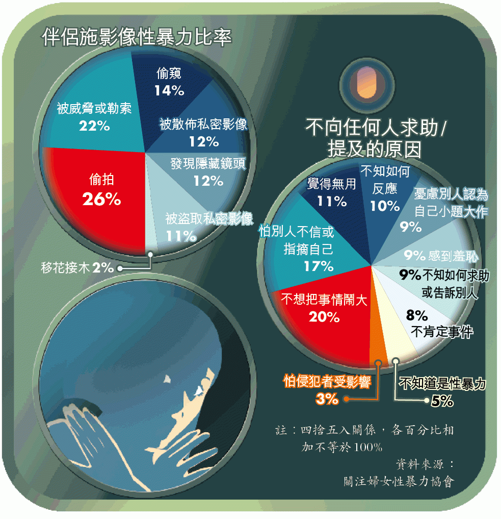 調查歸納出受訪者遇到的影像性暴力行為,最普遍是偷拍(34%)及涉及私密影像被散佈或被要脅散佈(28%),其次為偷窺(19%)、盜取私密影像(10%)、發現隱藏鏡頭(6%)及移花接木(3%)。