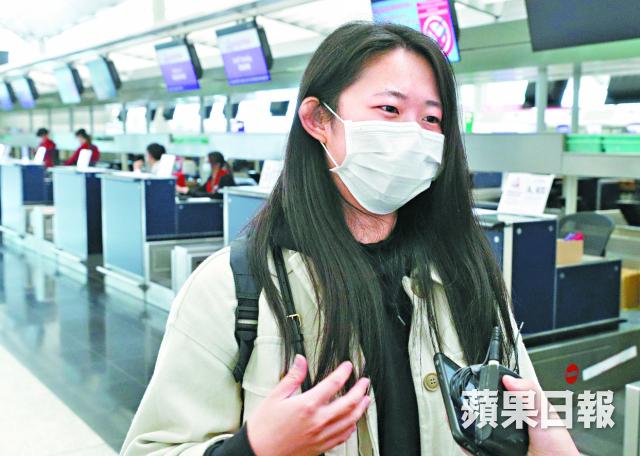 日本人Airi(圖)昨日乘搭飛機回東京,她是來港留學的交流生,因家人及所就讀大學校方要求她回日本,所以兩日前花約1,150元買機票。她表示知道日本疫情越來越嚴重,笑言香港情況反而更穩定、安全,但因大學要求,所以只好回鄉。她從其母口中得知當地亦有口罩短缺問題,連廁紙、衞生巾亦有人搶購。媽媽早前曾寄口罩給她,現在回國就將口罩帶回日本。