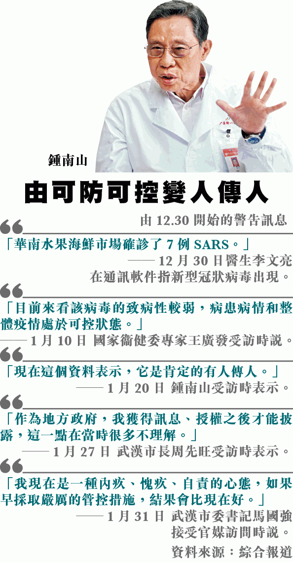 直到12月30日,有人嘗試吹響哨子,在聊天軟件群組說了:「華南水果海鮮市場確診了7例SARS」,他們是武漢市中心醫院眼科醫生李文亮等八人,但他們的下場是被警察訓誡,被指造謠。