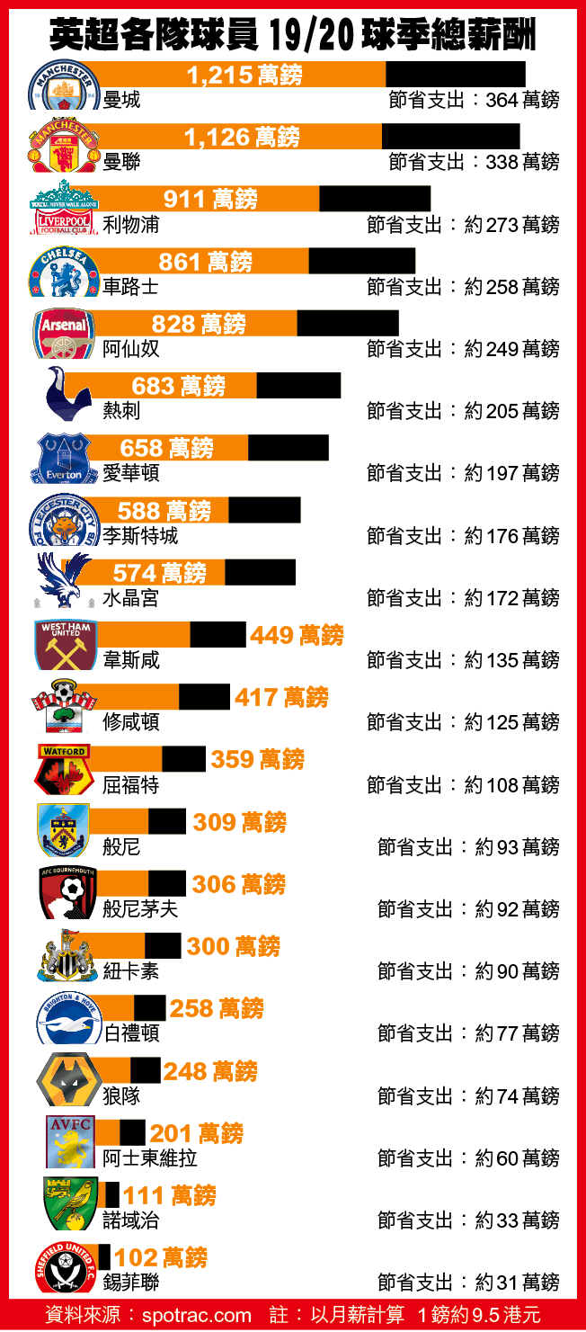 英超自上月宣佈停擺後,原定本月30日重開,但由於英國當地疫情不斷惡化,復賽可謂遙遙無期。據畢馬威會計師行統計,英超停擺導致20支球隊,潛在損失高達11.25億鎊(約107億港元),包括約7.03億鎊的電視轉播收入、約2.64億鎊商業收入及約1.58億鎊的比賽日收入,平均每隊損失逾5,500萬鎊,故各球會已向球員提出有條件減薪30%,這是按今季沒比賽、球會失去比賽日及轉播費收入下計算。