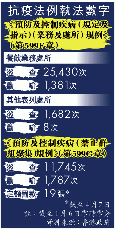 規例實施逾一周,政府共巡查餐飲業務處所25,430次,發出1,381次勸喻,但零檢控。港大感染及傳染病中心總監何栢良指出,一直建議規例限制食肆只能提供外賣服務,認為越快斬斷社區傳播,對恢復商業活動才越有利。如果措施一直拖拉,對中小企造成傷害越大,他估計有關法例需要延長。政府須透過果斷措施「零容忍執法」,否則將難斬斷社區傳播鏈。