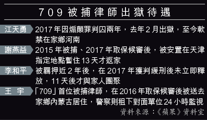 李文足昨表示,丈夫曾患中耳炎,「肯定是被抓的時候嚴重了」,但通電話感覺他精神不錯。她接受美媒採訪時指出,王的記憶力頗差,社區人員幫他買手機,「微信搞好久都沒註冊好,說驗證碼記不住」。另一維權律師江天勇的妻子發帖指,709被釋放者都曾遭酷刑,「江天勇『被釋放』到現在一年多了,尾骨損壞,到現在還不能坐立!」