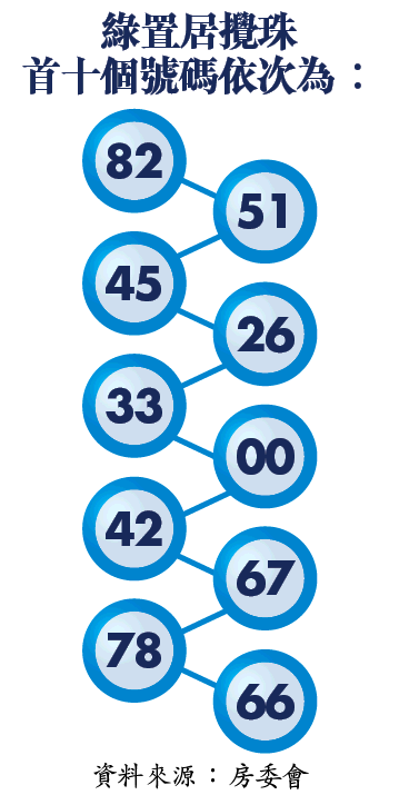 最新一期綠置居計劃昨以電腦抽出100個號碼,首十個號碼依次為82、51、45、26、33、00、42、67、78、66。申請人因應其申請編號的最後兩個數字,按攪珠結果決定揀樓先後次序。