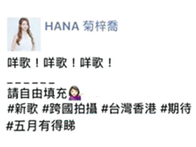 另外,菊梓喬前晚在社交網留言宣傳下月推出的新歌,她hashtag寫上「跨國拍攝」及「台灣香港」,約20分鐘就刪走這兩個hashtag,可惜網民已cap圖,有圖有真相。