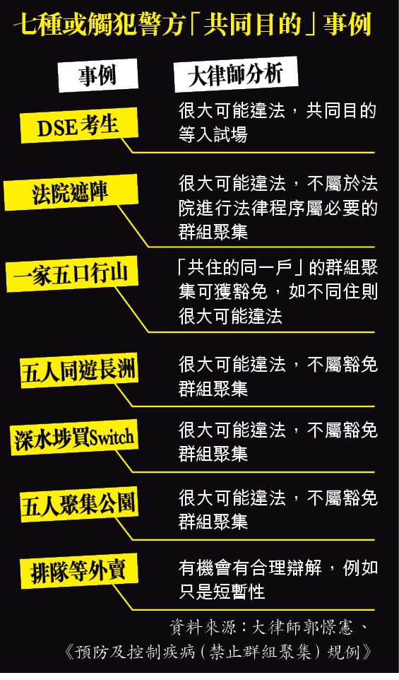 執業大律師郭憬憲指,在試場外聚集的DSE考生,「共同目的」是等候進入試場,符合警方定義,很大可能違法;一行五人同遊長洲,亦很大可能違法,且不屬獲豁免的群組聚集;前往深水埗購買遊戲軟件、在公園休憩、在法院外為被捕抗爭者組成雨傘陣等亦很大可能違法。至於排隊等候外賣,則可作合理辯解。他補充,限聚令所指的群組聚集是非常闊的範圍,凡多於四人的聚集已算違反,若認真執法,除獲豁免情況,幾乎全港四人以上的聚集都要被票控。