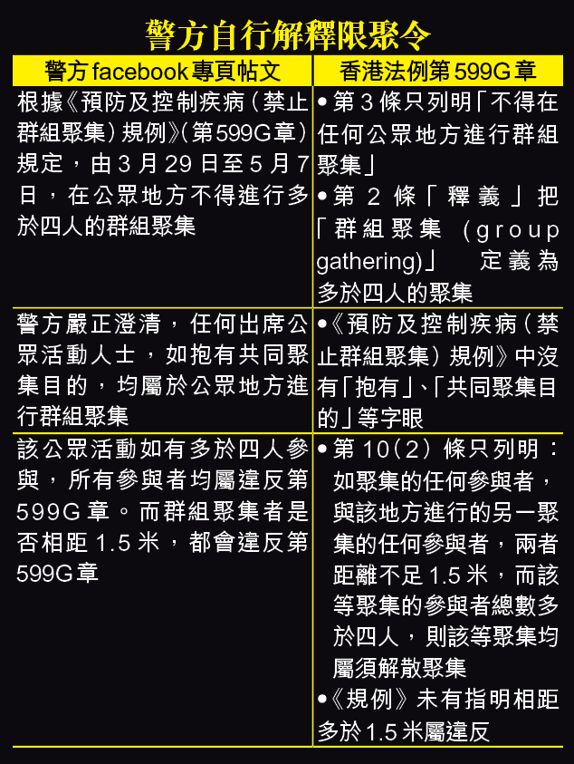警方周日傍晚在fb專頁發出「嚴正澄清」:「任何出席公眾活動人士,如抱有共同聚集目的,均屬於公眾地方進行群組聚集」;若活動有多於四人參與,即所有參與者均違反限聚令,並稱群組聚集者是否相距1.5米都會違反有關規例。