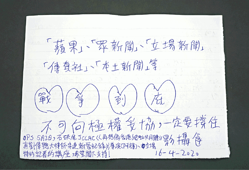 影攝食仲話,香港唔可以冇咗抨擊政權、不向惡勢力低頭嘅報紙,如果失去咗呢啲良心媒體,香港只會淪為一國一制。佢會繼續吩咐朋友為自己訂閱《蘋果》,八方係度向感謝影攝食,亦會如佢所言「不氣餒,不失望」,復活香港。另外,石硤尾賽馬會創意藝術中心周六舉行嘅「香港國際攝影節2020衞星展覽」會展出「影攝食」嘅作品,當日主題係「再想像香港爬山共同體」,到時有劉偉聰大律師等人出席講座,有興趣嘅市民當日可以去參觀。