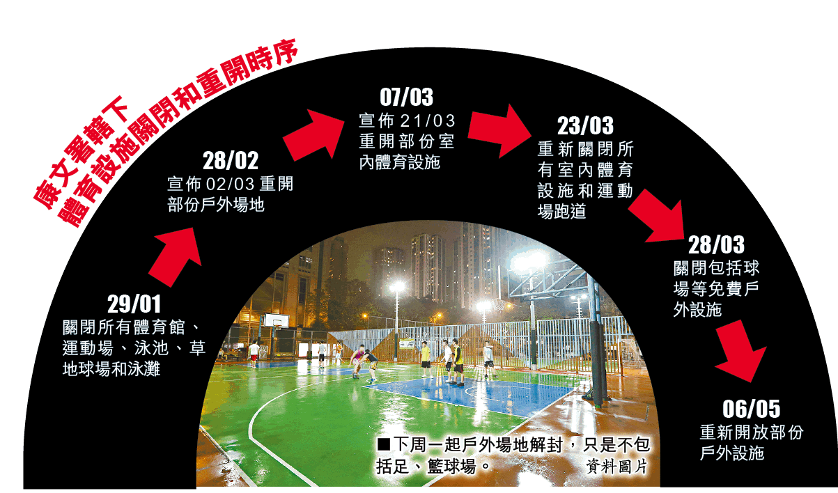 武肺疫情緩和,特首林鄭月娥周二上午宣佈下周將開放康文署轄下的室外運動場,然而愛好球類運動的市民空歡喜一場,昨晚康文署發新聞稿公佈兩階段「重開」細節,下周三(6日)起運動場跑道、滑板場等設施將重新開放,惟公眾泳池、泳灘、足球場及籃球場等繼續關閉,重開無期。