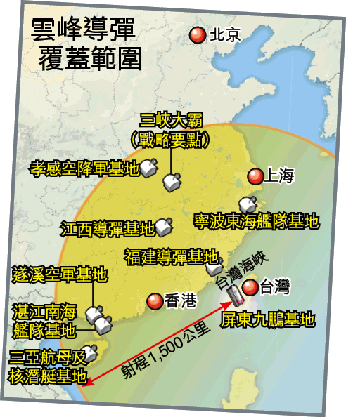 兩岸關係日趨緊張之時,台媒披露台軍近日密集試射各式中程導彈與火箭,其中備受矚目的是射程達1,500公里的「雲峰」中程導彈。該導彈可覆蓋鄭州、武漢以東地區,包括三峽大壩,以及華東、華南諸多中共軍方基地,對大陸「武統」台灣構成反制力。據報該型導彈已開始量產。