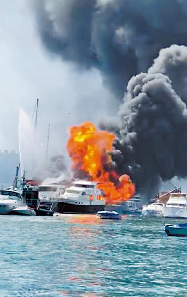 【本報訊】一艘停泊在觀塘避風塘的遊艇,昨午突然起火,波及旁邊另外兩艘遊艇,船艙火光熊熊,火勢猛烈更一度傳出爆炸聲,冒出大量黑煙席捲半空,遠至維港兩岸亦有市民目睹冒煙,多名途人見狀報警。消防接報後,派出消防船到場開喉射水撲救,約一個多小時後終將火救熄。事件中三艘遊艇均翻沉,沒有人受傷。