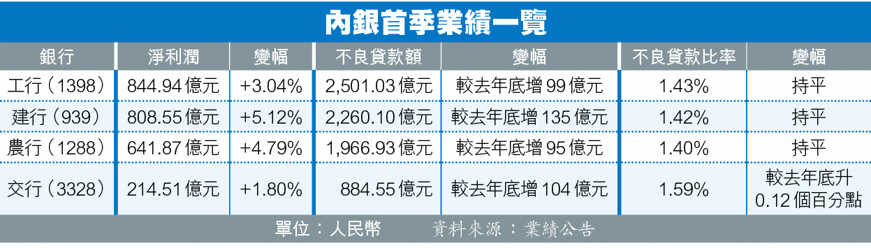 工行(1398)及農行(1288)不良率同樣與去年底持平。工行季內多賺3%至844.94億元,但不良貸款較去年底增加99.16億元至2,501.03億元,不良率1.43%。