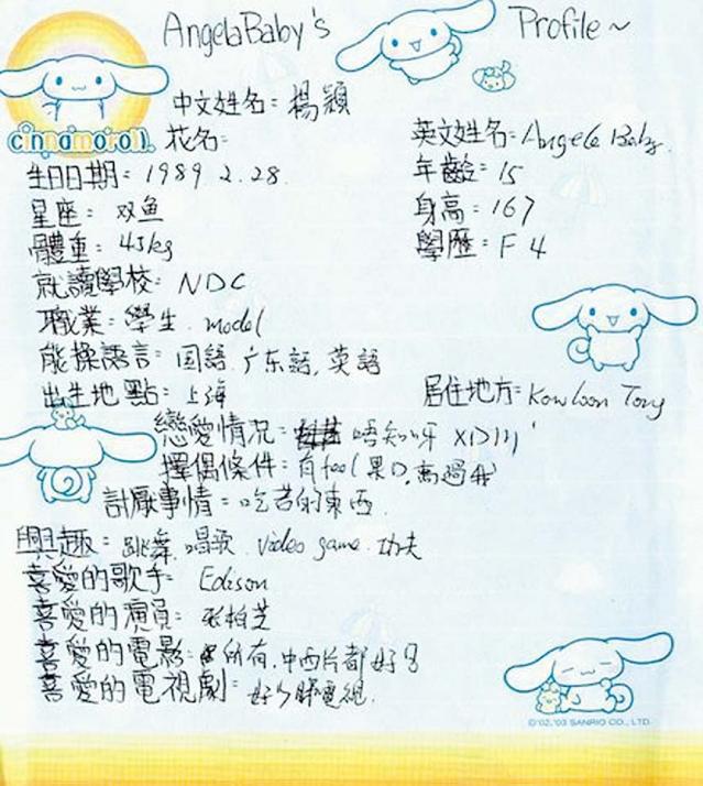 楊穎(Angelababy)前日在網上貼出一張15歲時手寫的「AngelaBaby's Profile」,疑似中學的紀念冊。當中提及中四時已身高167cm,但當時只有45kg,不足100磅,身形瘦削,家住九龍塘的她,更開始做兼職model,她又搞笑地提起擇偶條件:「有feel嗰啲,高過我。」但戀愛情況就刪了兩個字,然後才寫上「唔知呀。」