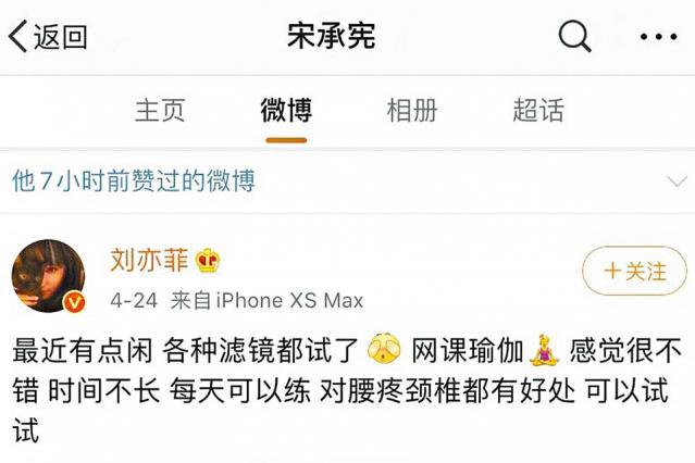 而劉亦菲日前如常在微博分享練習瑜伽時的自拍照,就有眼利的網民發現宋承憲有讚好相片,即時引來熱烈討論,且越傳越烈,有人推測宋承憲與劉亦菲是否復合,因兩人已有一段時間沒有互動,突然讚好似乎不只是再見亦是朋友般簡單,不過也有網民認為即使兩人已分手,宋承憲只是「禮貌like」,並沒有甚麼大不了。