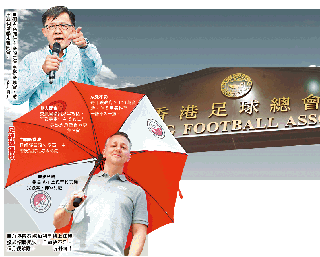 被批評管理不善的足總,每年獲政府2,100萬資助,但管治問題叢生,無論在人力資源管理、賽事入場人數及收入、評估表現及行政方面均有不足,而足總今季董事局換屆,由副主席貝鈞奇出任主席,可是最近一次董事局會議,竟更改恆常投票通過議案方式,改為要求出席會議董事以拍掌通過各項決定。