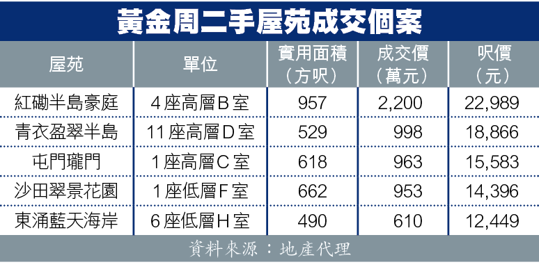 疫情令樓價稍為回落,有人睇準時機入市,美聯物業何勇方表示,青衣盈翠半島在五一假期睇樓氣氛暢旺,單日有近20組客睇樓,其中11座高層D室,實用529方呎,兩房間隔,望維港海景,業主以998萬元放售,吸引3組客洽購,最終零議價售出,新買家細屋換大屋,打算用作自住,呎價18,866元。