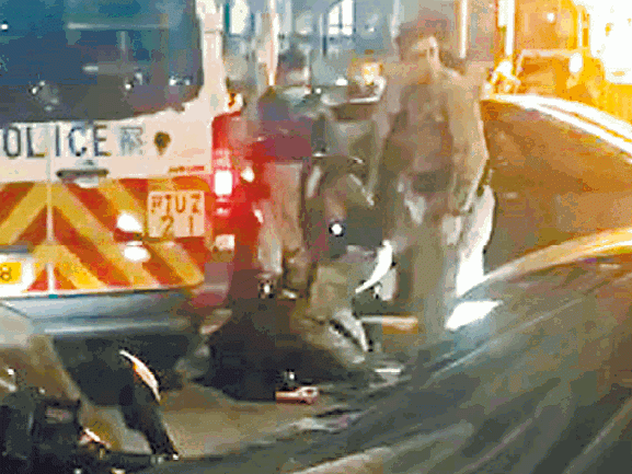 另一名紅衣男子同被警員制服,有警員喝斥:「你開車差啲夾到差人呀!你開車撞警察呀𠵱家,襲警呀你!」防暴警將兩人反手扣上索帶拘捕,紅衣男被帶上警車時遭用力拉扯,黑衣男左額及臉部有明顯傷痕。