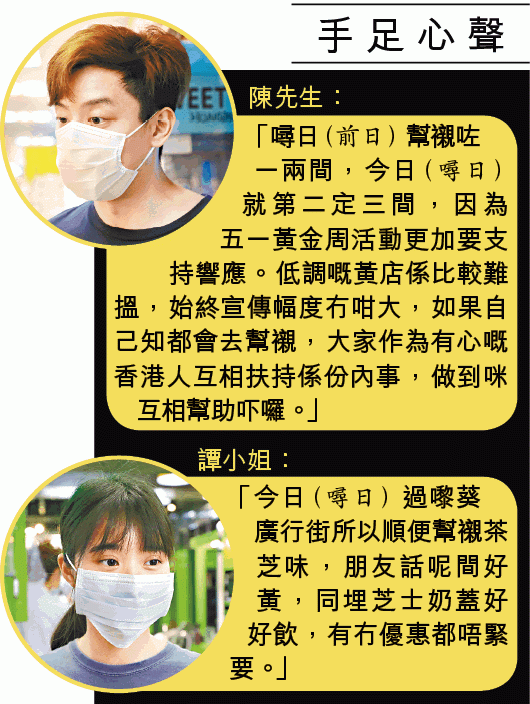 【本報訊】昨日是五一勞動節,亦是黃色經濟圈發起「五一黃金周」第二日。有網民不滿警方打壓遊行,昨發起「天馬行動5.1」全港快閃突襲,警方派出重兵於多區巡邏應變,活動主辦單位其後公佈行動原來是「突襲」黃店,呼籲市民全力支持黃色經濟圈,澄清從無說過會有勇武行動。有黃店負責人指黃金周首日人流和生意已上升約一成。有學者認為,市民不會因政府打壓和警方針對黃店而改變消費模式,相信黃色經濟圈會持續一段時間。