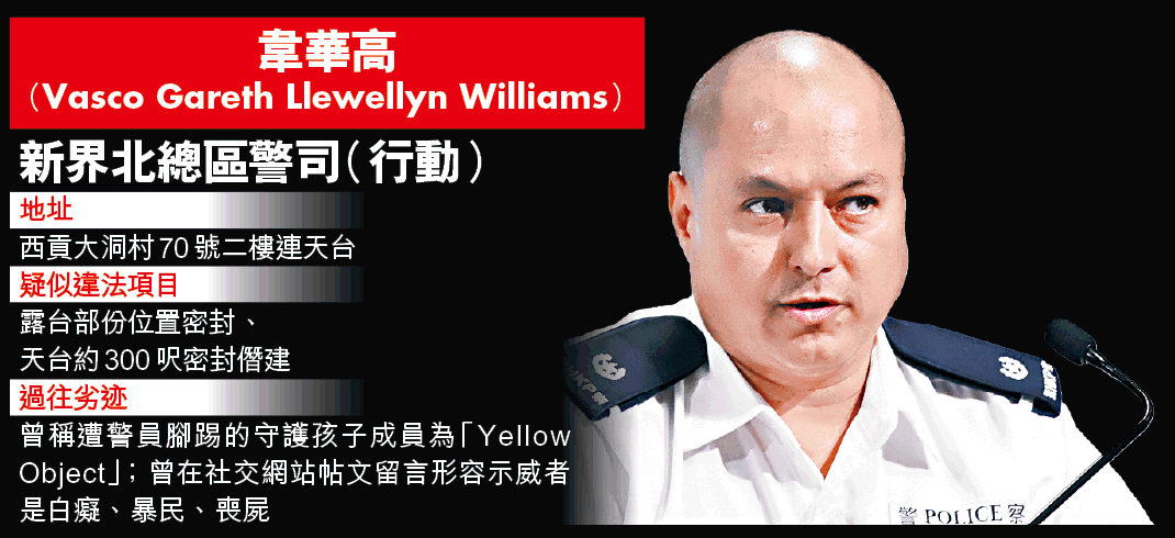 另外,現職新界北總區警司、視被捕人士為「Yellow Object(黃色物體)」的外籍總督察韋華高(Vasco Gareth Llewellyn Williams),其位於西貢大洞村70號村屋,亦同樣出現涉嫌僭建情況。據查冊所知,該幢村屋二樓連天台單位乃韋華高於1995年以240萬元購入,該地段亦屬鄉村式發展土地,同為丁屋。