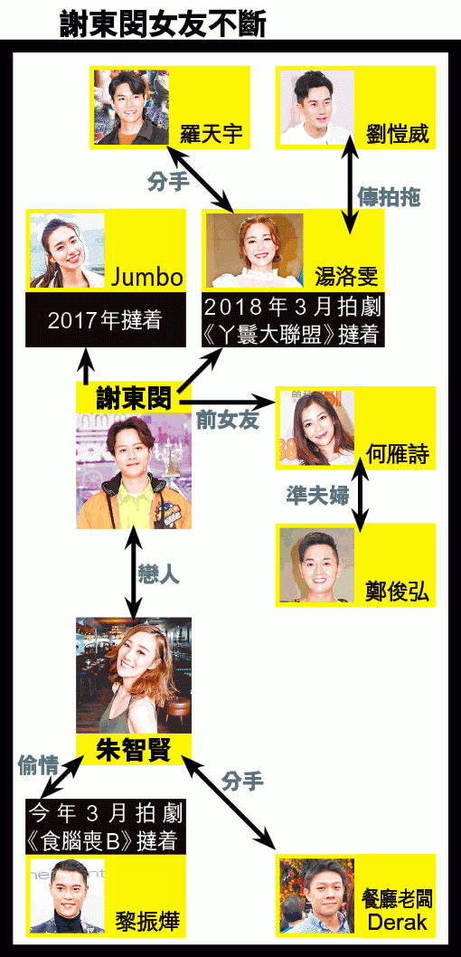 《蘋果》收到消息,一直扮演「暖男」護女友的謝東閔,原來曾先後兩次背女友偷食,朱智賢和謝東閔三年前合作拍攝節目撻着,不過雙方一直未有承認戀情。據知謝東閔和朱智賢拍拖不久,男方曾和2011年中國小姐三料冠軍曾淑雅(Jumbo)暗撻,不過和朱智賢仍屬熱戀期的謝東閔,很快便將這段霧水緣斬纜。直至2018年初,謝東閔拍劇集《丫鬟大聯盟》,碰巧同劇的「靚湯」湯洛雯此時和拍拖四年的羅天宇分手,劇中她和謝東閔有多場對手戲,一向屬「戰鬥格型」的靚湯,明知謝東閔有女友,見有筍盤亦不惜施展迷暈攻勢,最終成功攻陷謝東閔,而為新劇宣傳時,靚湯不避嫌大讚謝東閔說:「佢都OK嘅,高高大大,靚靚仔仔。」
