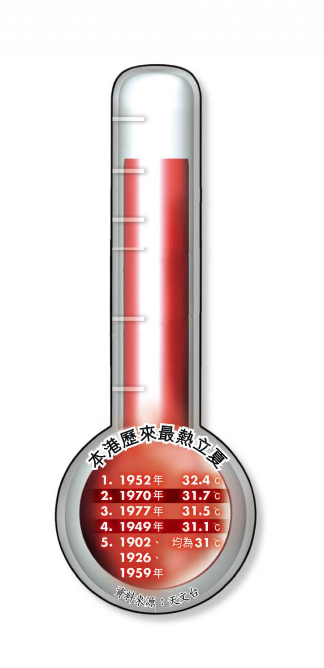 【本報訊】連日來天氣炎熱,昨日中午市區錄得今年最高溫31.5℃,今日是廿四氣節之一立夏,天文台預計最高氣溫達32℃,有機會追平、甚至打破1952年錄得立夏最高溫32.4℃、保持了68年的紀錄。天文台預測明日起一連四日出現高達33℃的酷熱天氣,有機會發出今年首個酷熱天氣警告。炎熱天氣下,有市民行山疑中暑暈倒命危,亦有家住深水埗唐樓的基層家庭擔心炎夏漫漫,劏房寓所有如蒸籠。
