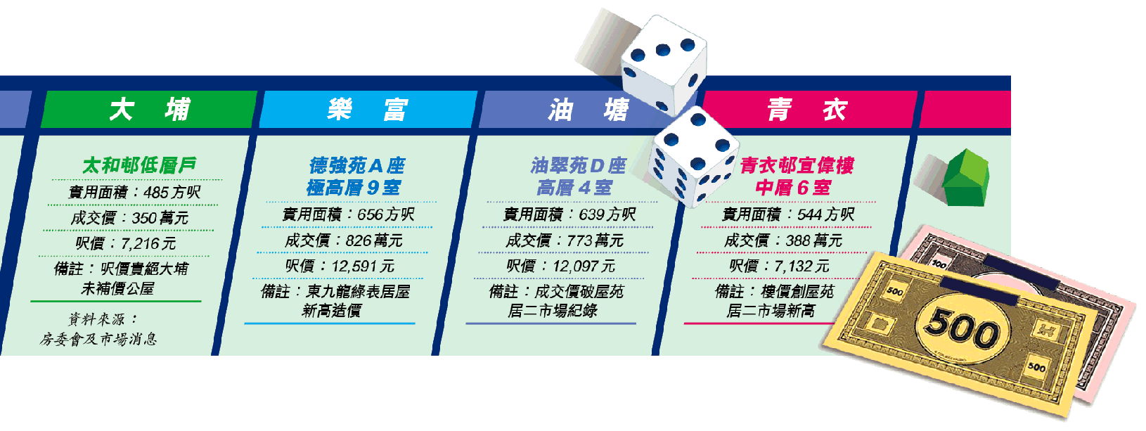 資助房屋破頂潮蔓延至公屋市場。上月錄得16宗未補地價公屋成交,當中大埔太和邨一個實用485方呎的低層戶,成交價350萬元,呎價高達7,216元,打破同區富善邨上月錄得每呎7,187元的舊紀錄,成為大埔歷來呎價最貴未補地價公屋。此外,黃大仙東頭二邨一個實用439方呎中層戶,以361萬元沽出,呎價8,223元,創屋苑今年新高。