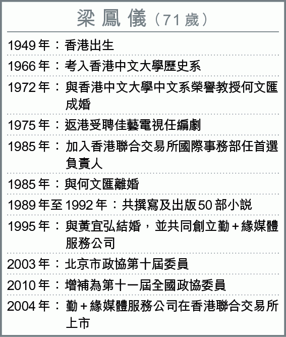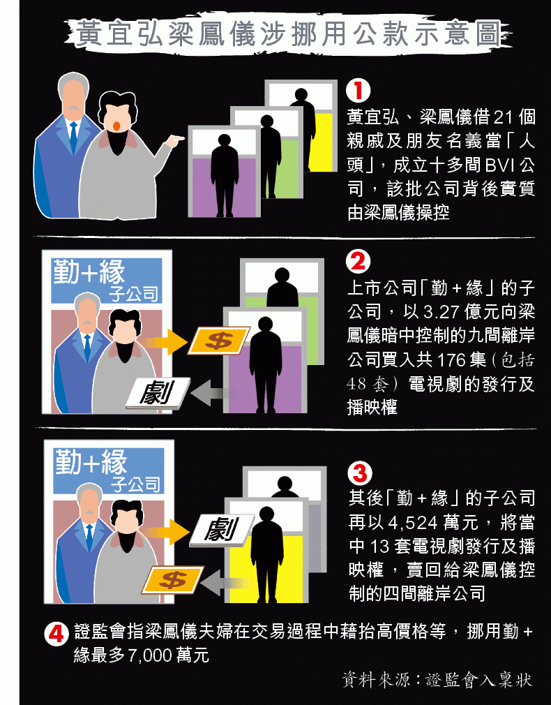 【本報訊】曾創作多部小說的上市公司勤+緣(2366,現稱星美文化)創辦人梁鳳儀,及其夫立法會前議員黃宜弘被指挪用公司資金。《星島日報》引述證監會入稟狀指兩人2010至2012年間借用21個「人頭」成立逾10間BVI公司(離岸公司),將共176集(包括48套)電視劇播映權賣予上市公司,涉資3.27億元。入稟狀指交易涉抬高金額,藉此挪用公司7,000多萬資金。證監會對於入稟事宜不予置評。市場人士認為,證監會事隔多年才以民事起訴,是有意放生,事後再以刑事控告的機會微。