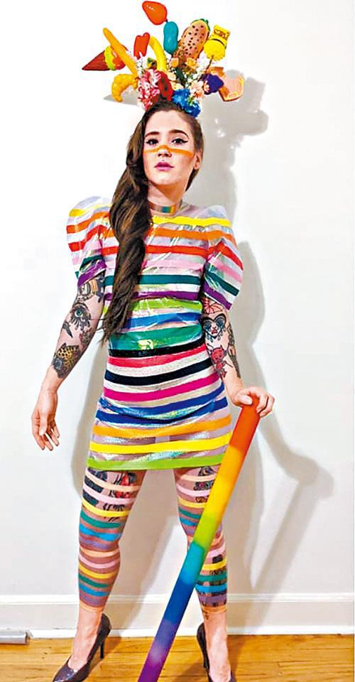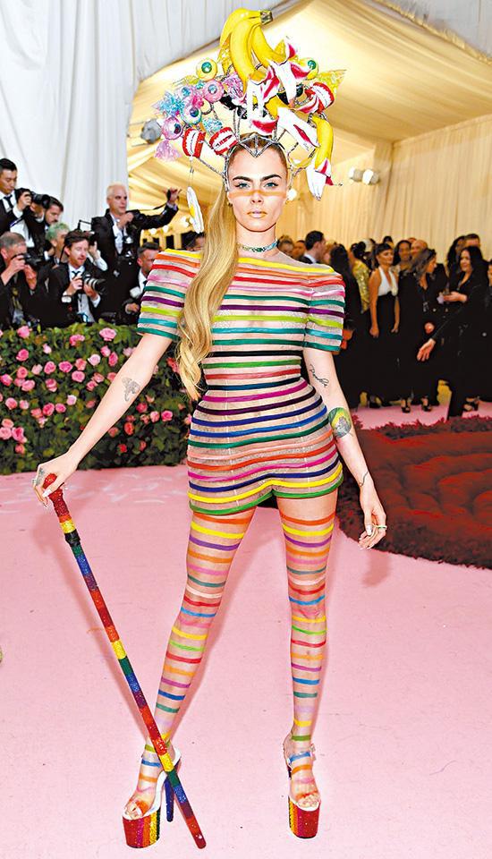 Cara Delevingne甚麼造型都挑戰到,這襲七彩條子Dior jumpsuit 當時用了600小時完成,頭頂的假牙、香蕉全以Swarovski製作,@clowntearz以七彩膠帶加膠玩具加工,完成居家版本。