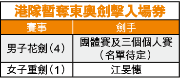 東奧計分賽原本由去年4月3日至今年4月4日結束,在疫情搞亂賽期前,香港按東奧排名已鎖定五張入場券,包括男子花劍的團體賽及附帶而來的三張個人賽,以及江旻憓的女子個人重劍。