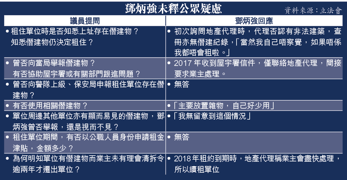 鄧炳強稱如涉及任何違法行為,若有責任絕不會逃避,「但事實並非如此」。他指2016年租住單位時已詢問地產經紀有否非法建築,對方當時否認;他查冊亦無僭建紀錄,「當然我自己唔察覺,如果唔係我都唔會租啦。」