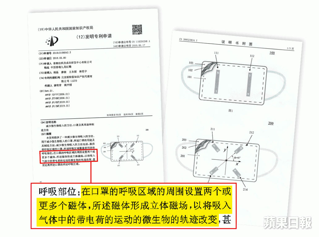 根據有關專利文件,涉及的專利技術是在口罩中加入薄磁片而製造出「弱磁場」,從而改變空氣中微粒的運動軌迹,令口罩纖維更易阻隔微粒。當日獲發明金獎的可重用口罩,只有三層及可清洗10至20次,根據當時產品描述,目的是用以擋隔空氣污染,惟這些元素全在銅芯口罩中消失。銅芯口罩設計成六層,並利用銅表面不利細菌存活的特性作為抗菌物料。換言之,跟弱磁場抗污染口罩是完全不同的另一產品,肯定不屬於金獎設計,亦沒應用相關專利的核心技術。惟前日創科局卻以此刻意誤導市民。