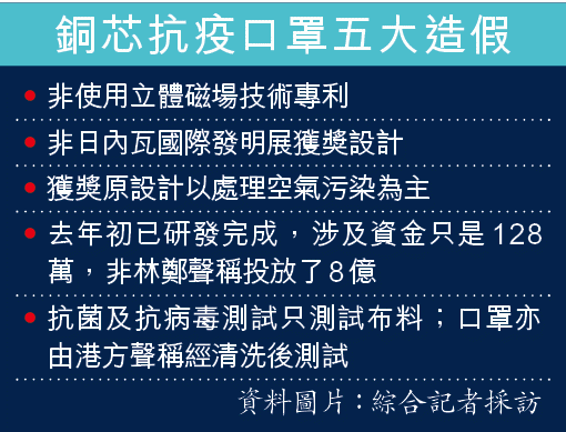 【本報訊】新任創新及科技局長薛永恒連日來大力推銷即將全民派發的口罩,宣稱由理工大學旗下香港紡織及成衣研發中心(HKRITA)開發的銅芯技術口罩獲得專利,又展示口罩獲日內瓦國際發明展金牌。本報追查發現,銅芯口罩原來沒有加入獲得專利及獎項的「弱磁場防污染」技術,設計採用了風馬牛不相及的「以銅防菌」。公民黨立法會議員陳淑莊得悉後多番形容事件「匪夷所思」,直指事件屬嚴重醜聞,「若係商品買賣,已係涉及失實聲明嘅違法行為」。