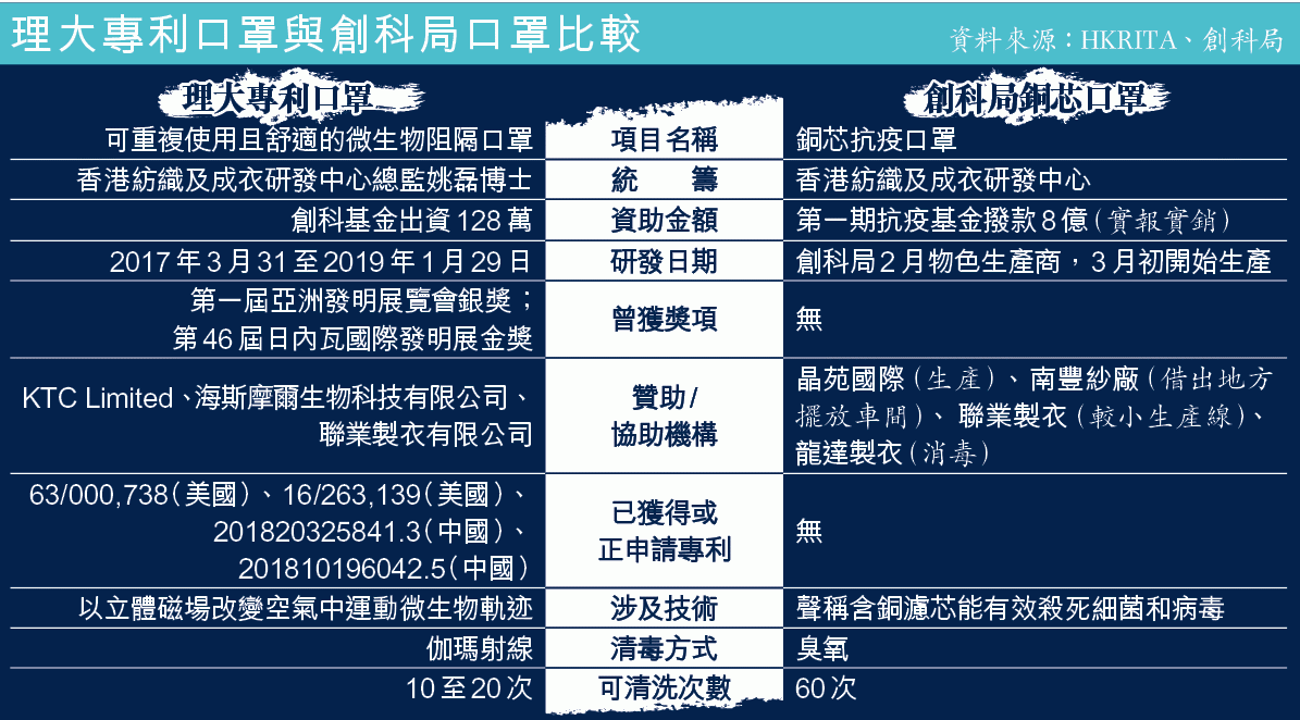 不過,銅芯口罩跟有關獎項及相關專利技術其實毫無關係。HKRITA是由政府撥款、理大承辦的非牟利機構,本報翻查HKRITA網頁的項目資料庫,發現只有兩個研發項目跟口罩有關,其中「開發可重複使用且舒適的微生物阻隔口罩」的研發項目跟當局描述脗合,該項目獲創科基金128萬元資助,由2017年3月開始至去年1月完成,並取得第46屆日內瓦國際發明展金獎(2018年),同時在中國及美國各持有或申請兩項專利,有關專利申請號碼就跟銅芯口罩申領網頁的完全相同。