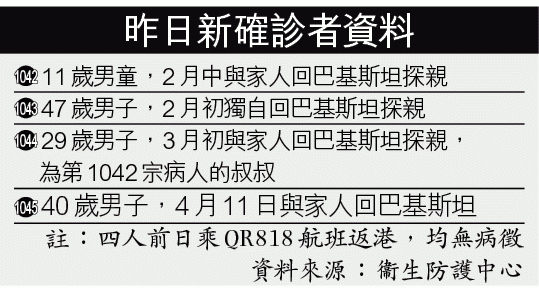 衞生防護中心傳染病處主任張竹君昨表示,四名新確診患者均為男性,年齡介乎11至47歲,先後於2月初至上月初與家人到巴基斯坦探親,當中兩人為叔姪,曾一同吃飯。四人前日乘搭QR818航班取道多哈返港,抵港時均無病徵,在亞博館抽取深喉唾液樣本檢測後呈陽性。四人合共有13名一同返港的家人列為密切接觸者,初步檢測呈陰性,已連同其他由巴基斯坦抵港的旅客送往檢疫。張竹君指近日陸續有港人由巴基斯坦自行搭飛機回港,連同專機共有750人,全部送往駿洋邨檢疫,重申他們對社區風險低。
