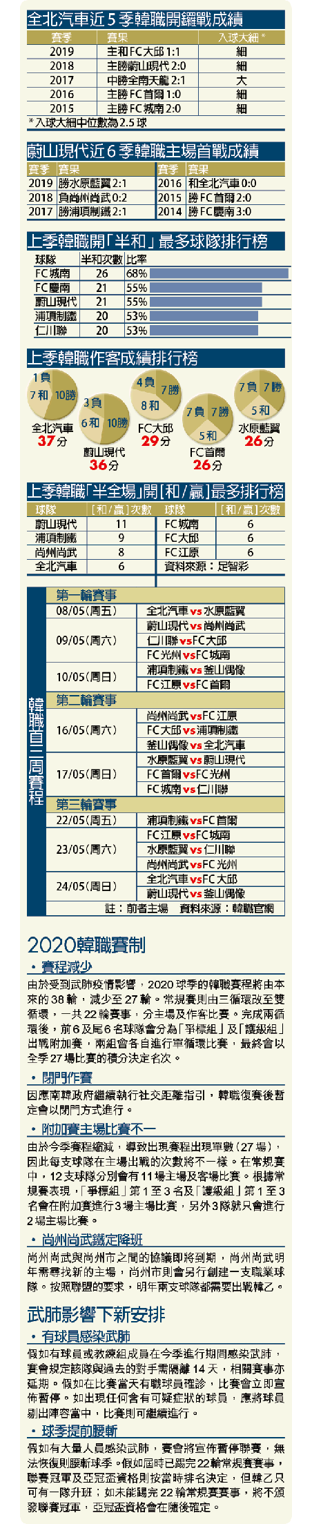 受武漢肺炎疫情拖累,自3月23日澳職紐卡素噴射機對墨爾本城一戰後,足智彩便再沒賽事受注,原本2月29日開鑼的韓職也延期了兩個多月,至上月底才宣佈在今月重開,新賽季賽程也因此縮短;按往年,12支球隊在常規賽及季後賽共進行38輪比賽,現減為27場,常規賽會由三循環改為雙循環,然後分為爭標及護級組,每隊會再踢五場季後賽定出最終排名,季初的比賽都會閉門進行,直至另行通知。