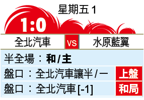 猶幸全北於防守方面仍予人穩健感,今季引入洪正好及吳反錫兩位國腳級中堅,配合左閘金珍洙、門將宋範根等原有主力,防線屬韓職中一等一;事實上全北上季只失32球,主場失15球,都是韓職最佳,今仗面對實力下滑的水原,料可保住清白身。但畢竟韓職重開決定倉促,全北賽前也只有兩場熱身賽,包括周日3:1擊敗大田市民,前鋒韋迪維積克正選卻交白卷,整體戰力亦未見冒起,今仗難望大炒對手,如嫌上盤只「食半格」,敲主隊小勝一球取「和局」也是半冷之選,有3.3倍。