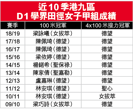 拔萃女書院在港九區D1學界田徑錄得13連霸,但教人意外是這支傳統勁旅在A grade 100米及接力賽曾多年未曾奪冠,上一位女拔萃出品的「百米飛人」,已經要追溯至09/10賽季的梁巧詩(見附表)。