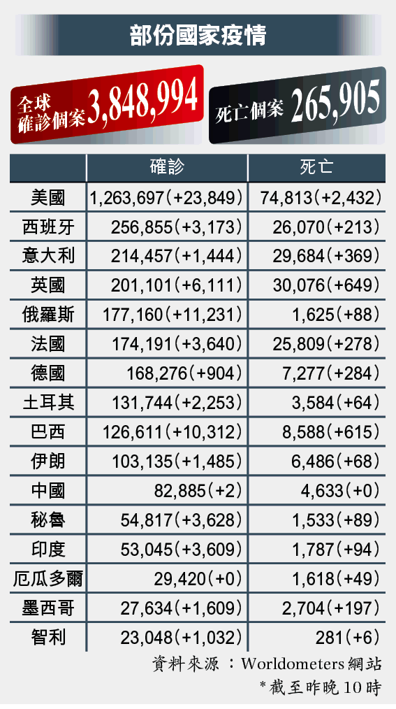 巴西已成武漢肺炎大流行的新震央,染病人數突破12.6萬,惟學者認為官方數字為冰山一角,受感染者或已高於全球最嚴重的美國官方數字。而總統博爾索納羅繼續淡化疫情,他周二揚言「最壞情況已經過去」,但話口未完,該國當天錄得新高的單日死亡增幅,情況前天持續惡化,累計8,588人病歿。