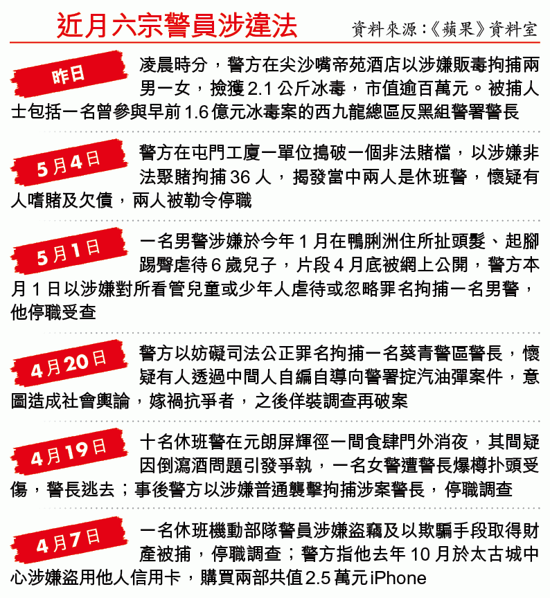 【本報訊】去年逆權運動展開至今,警方被狠批濫權濫捕,七警案記憶猶新,警員操守惹人質疑,最近短短兩個月便發生六宗警員捲入涉嫌聚賭、自編自導「破案」、襲擊同袍、盜竊及虐兒的刑事案件,多人被捕並停職等候調查。公務員事務局上月曾披露,2019至2020財政年度,截至去年底,警務處錄得95宗因干犯刑事罪行被定罪或違反紀律而被懲處的個案,冠絕紀律部隊。