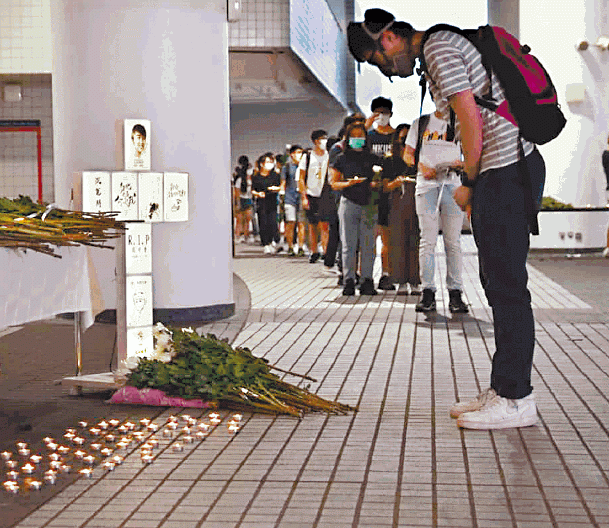 【本報訊】昨日科大學生周梓樂逝世六個月,屯門、元朗、天水圍及科大校園等區均有悼念活動。警方在屯門大會堂駐重兵,派半百警設起封鎖線,截查及驅趕途經的市民;元朗有市民到西鐵站連儂牆摺紙鶴及獻花,強調港人不因疫情而丟淡事件,「想同周同學講香港人並未放棄過你」。
