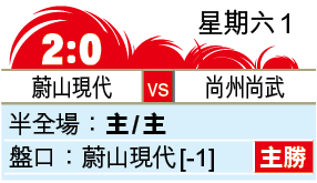 上季屈居韓職亞軍的蔚山現代,新一季銳意捲土重來,引入多名具級數新兵,加上原有主力祖利亞尼加奧、金仁成等,實力甚強,周六主場揭幕戰鬥「哀兵」尚州尚武,不單可大勝響頭炮,「讓球主客和」放心取「主勝」。