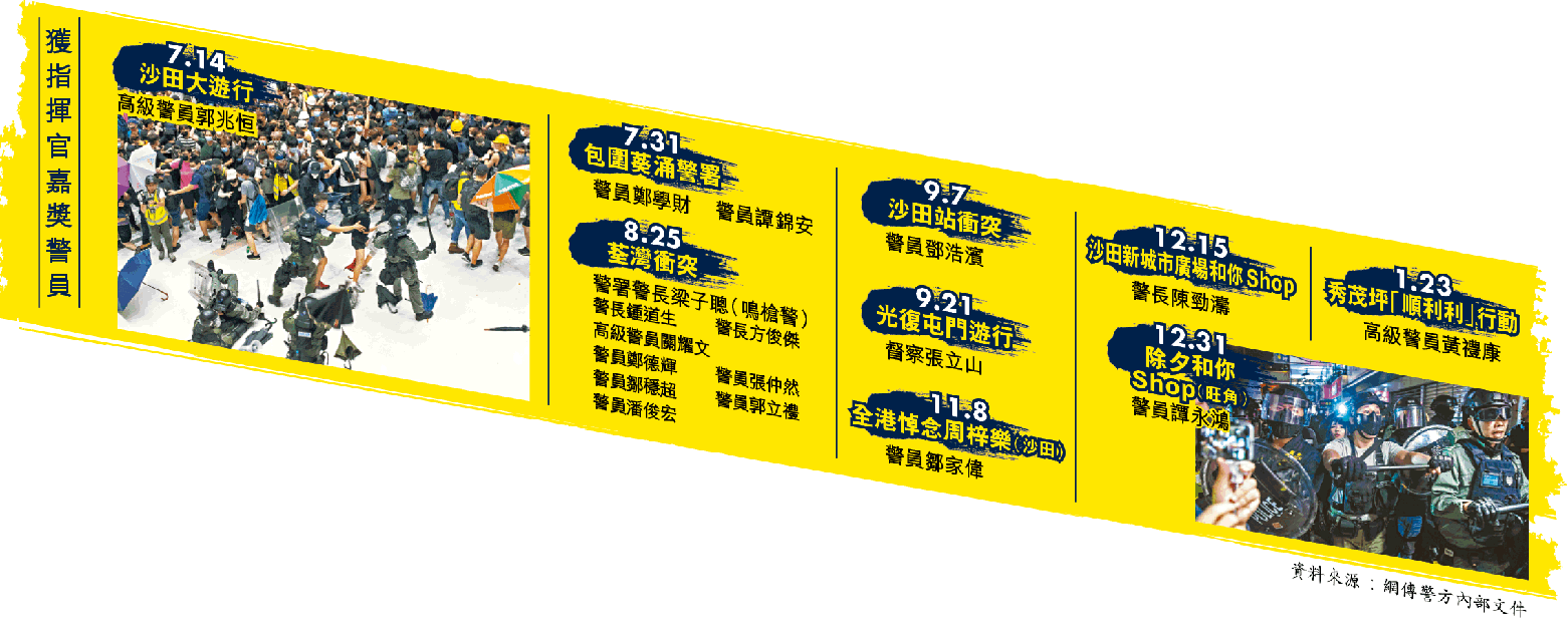 網傳一份警隊人事通告,12組共18名曾鎮壓反送中運動的警員獲「指揮官嘉獎」,本報查證得悉有關通告前日已刊於警隊告示欄,據悉今次屬首批人員獲嘉獎。獲獎者全是參與「踏浪者」行動受傷的警員,其中九人共涉三組,均曾參與去年8.25 荃灣衝突,當日曾有六警拔出佩槍,其中一人在鬧市中向天鳴槍,又有警員擎槍指向記者和人群,一名傳道人曾跪地阻攔但被警員踢開,其後警方形容是「用腳推開」。