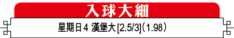 周日德乙聯賽上演榜首大戰,漢堡主場出擊迎戰一哥比勒費爾德。漢堡暫列次席但位置並不穩固,經過上場臨完場前失波失分慘況後,今場在地頭不容再失,勢必強攻對手,看好今場入球必多,捧[2.5/3球]「大」。