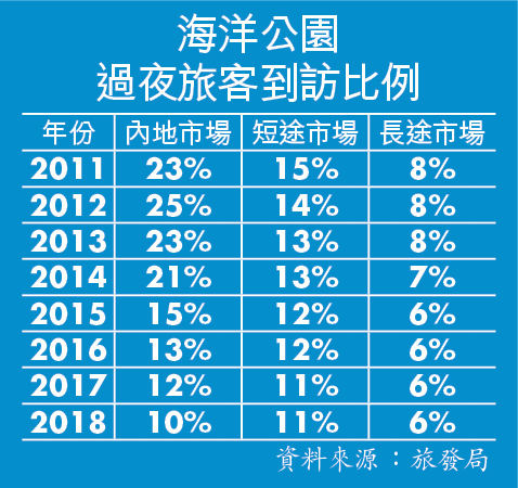 【本報訊】海洋公園倒閉危機未解,冰封三尺非一日之寒,旅發局《訪港旅客分析報告》每年都會收集不同市場過夜旅客到訪的十大景點,結果顯示,海洋公園在長途市場的景點排名,歷年均十大不入,歐美旅客鍾情香港公園多於海洋公園,比例有上升趨勢,海洋公園重點依賴的內地旅客比例近年走勢亦告下跌。
