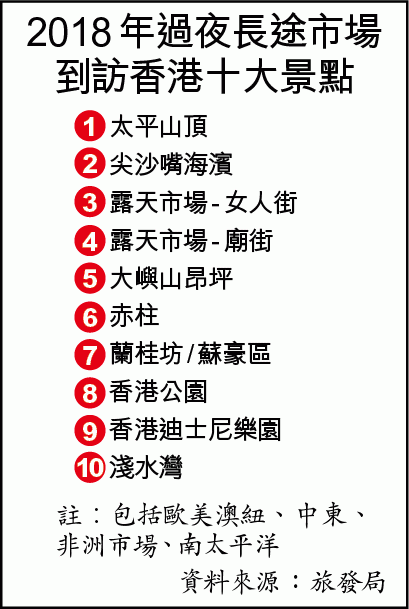 旅發局每年收集數據分析不同市場過夜旅客到訪的十大景點和比例,暫更新至2018年。兩個主題公園一直是過夜旅客十大到訪景點,2010年前是海洋公園排名較高,2010年起被迪士尼追上,2012年海洋公園獲得「全球最佳主題公園」扳回一仗,排第三高過第四的迪士尼,但後勁不繼,此後一直落後迪士尼二、三名。