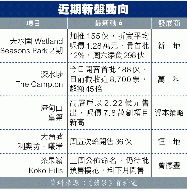 【本報訊】政治前景滿佈陰霾,但發展商仍加快推盤。新地(016)天水圍Wetland Seasons Park 2期落實周六添食,次輪開賣298伙,入場費398萬元;昨加推155伙,折實平均呎價12,783元,較月中首批140伙呎價11,368元貴12%。另萬科深水埗The Campton在今日國歌法二讀日開售首批188伙,日前截收8,700票,超額認購45倍。