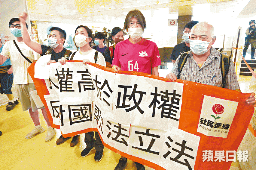 【本報訊】立法會二讀辯論被轟為惡法的國歌法,大批警員於金鐘一帶嚴密佈防,多個政黨及團體昨日先後到立法會門外請願,惟甫抵達金鐘海富中心即被警方以非法集結為由,予以驅趕,警方更擴大封鎖範圍,驅趕記者。職工盟秘書長吳敏兒欲前往立法會公眾席旁聽,同樣遭警方阻止。